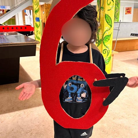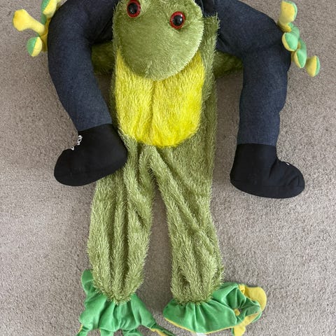 Hjemmelavet Svampebob kostume. Har vundet mest kreative kostume i 2024 😁 Indvendige mål: højde 63 cm, bredde 40 cm, dybde 23 cm, arm hul 15 cm, revne til øjne 11 cm.