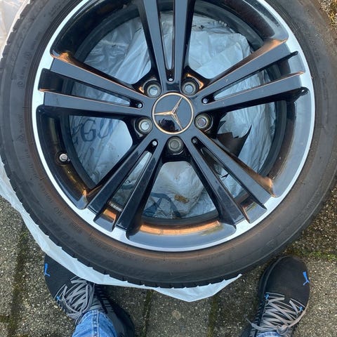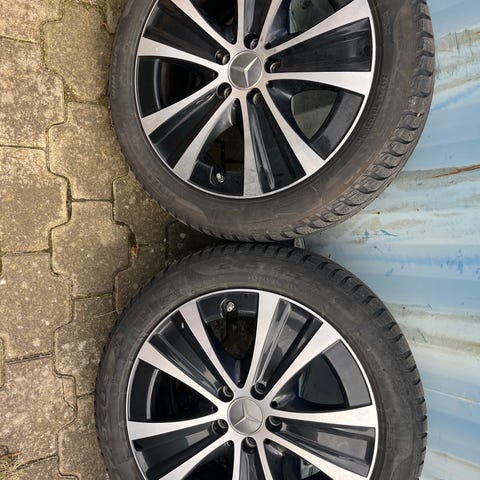 Originale fælge og dæk / vinterhjul til en Mercedes Benz E300e og E300de (W213) de har dimensionerne 245/45-18 foran og 275/40-18 bagpå.