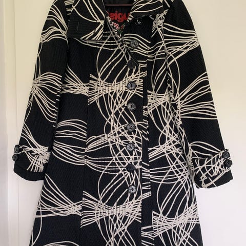 Desigual Frakke i sort farve, størrelse 40 til kvinder. Jakken har et mønstret design og lukkes med knapper. Materialet fremstår som en kombination af tekstiler med et dekorativt mønster. Frakken er velegnet til brug som yderbeklædning ved køligere vejr.