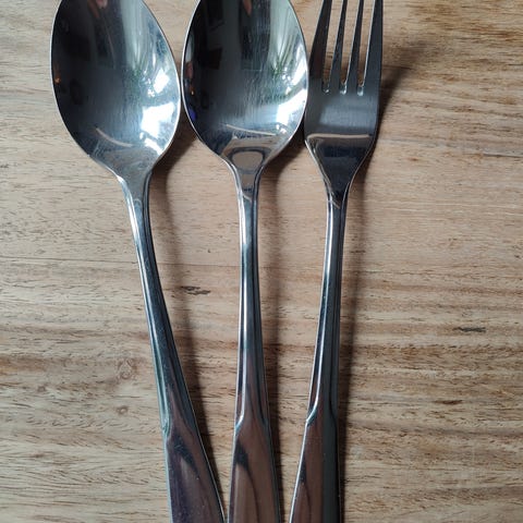 8 middagsskeer i bestikserien Hyacint sælges. Formen er den samme som bestikserien “Lilje”, ligeledes fra Raadvad, men en del af skaftet er i mat stål på “Hyacint” bestikket.