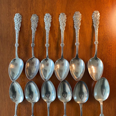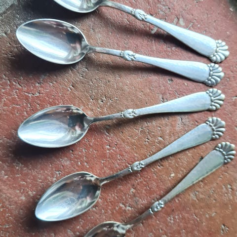 6 velholdte Spiseskeer i totårnet SCF mønster (S. Chr. Fogh 1947-1973). De er 20 cm lange. Samlet pris. Sender gerne