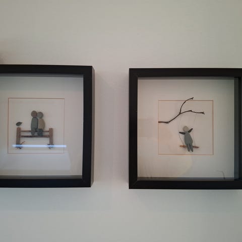 Rebecka R Handmade sten kunstværk sæt bestående af 2 billeder i sort ramme. Hvert billede viser minimalistiske figurer og ord lavet af små sten på hvid baggrund. Kunstværkerne er håndlavede og unikke, velegnede til vægophæng i hjem eller kontor.