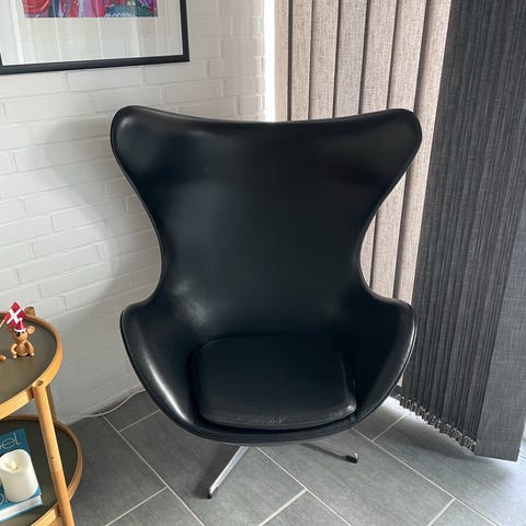 Arne Jacobsen lænestol med skammel produceret hos Fritz Hansen model AJ3316 Ægget. Når design, klassiker og kunst går op i en højere enhed. Et af vores tids mest kendte design. Stolen har vippefunktion og er i semi anilin læder. Passer ind i alle indretninger.