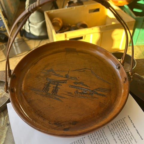 Japansk lakbakke (shikki eller nurimono). Disse bakker er traditionelle kunsthåndværk lavet af træ belagt med urushi-lak, en harpiks fra et træ.