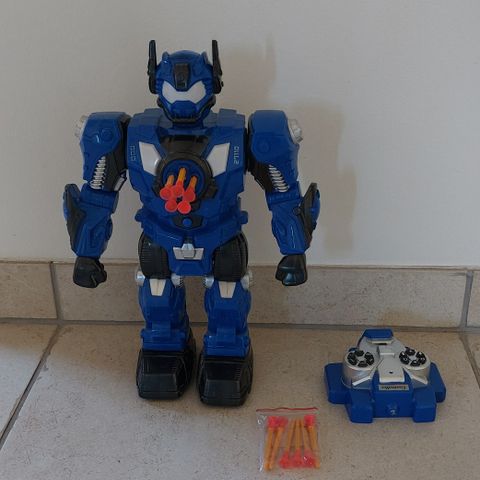 Robotten har en kanon på den ene arm og et gennemsigtigt blåt sværd på den anden, som det ses på billedet.