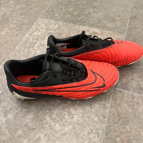 Nike phanthom fodboldstøvler i lyserød farve med pink sål og studs. Støvlerne har snørelukning og er designet til fodboldspil. Inkluderer en matchende opbevaringspose med Nike-logo. Størrelse 38.