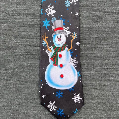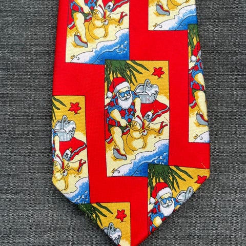Herre slips med julemand mønster. Slipsen har en grå baggrund med gentagne billeder af en rødklædt julemand omgivet af stjerner. Designet er velegnet til brug i juletiden og passer til herretøj.