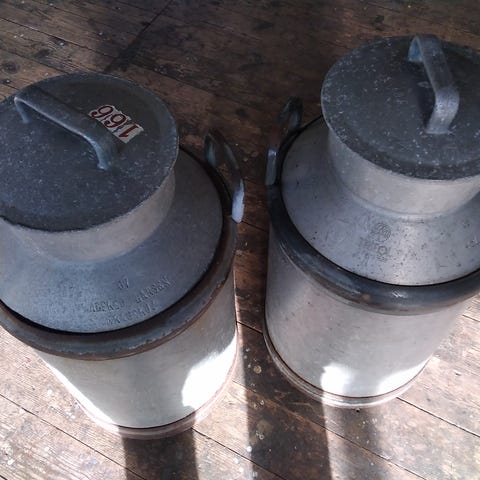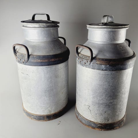 Original mælkejunge fra 60’erne–70’erne, som dengang blev brugt til at hente frisk mælk direkte på den lokale gård. Fremstillet i aluminium med galvaniseret bøjlehank, indstemplet 5 L og logo med opgående sol og bogstaverne F.M. Fin autentisk patina.