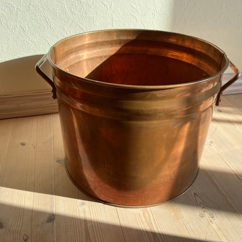 kobberspand, Brænde og pejsestuen samt messing gnistdannelser. Meget gammel fin brænde kurv/spand i kobber måler ca.50 cm i diameter og ca. 60 cm i højden. Stor og Rummelig med 2 håndtag samt extra rum i bunden for trærester ? Fremstår upudset i rustik stand . Vejer ca. 10 kg. Frontramme i messing til åben pejs følger med Måler ca.130 x 30 x 17. Der er behov for en reparation af messing kanten. Herudover 2.sæt pejse værktøj Et i kobber komplet og et i messing med 2 redskaber.