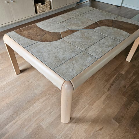 Sælger dette smukke og solide sofabord i massivt mahogni med dekorative keramiske fliser i et stilrent, grafisk mønster. Bordet har en varm mahogniglød og et tidsløst udtryk, som passer perfekt ind i både moderne, klassisk og retro indretning.