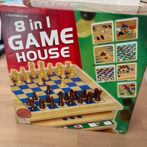 Classic træbrætspil sæt bestående af skak, backgammon, møl, dam, solitaire og kinaskak.Hvert spilbræt er lavet af træ og inkluderer tilhørende spillebrikker i forskellige farver og materialer. Sættet indeholder flere klassiske brætspil, velegnet til flere spillere og forskellige aldre. Spilbrættene er firkantede og har traditionelle designs til de respektive spil.