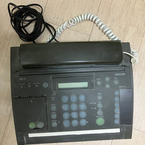 Philips HFC 8/20 faxapparat med sort farge. Enheten har numerisk tastatur, LCD-skjerm og standard telefonlinje-tilkobling. Strømforsyning: 12V, 2.3A. Laget i Østerrike.