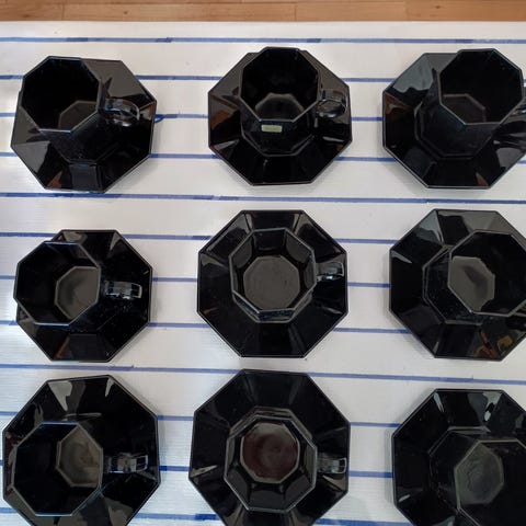 Har 5 krus, 8 tekopper og 8 underkopper. Én enkel kop med lille nag, se billede. Ellers i god stand med få krus med almindelige brugsspor/ridser.