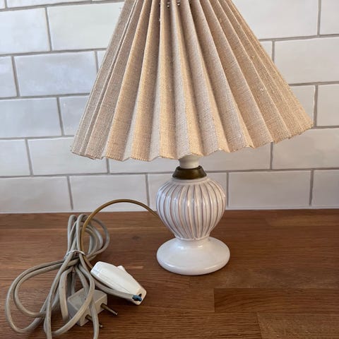 Anders Pehrson bordlampe i keramik med en hvid lampskærm. Lampen har et dekorativt mønster og er udstyret med en elektrisk ledning til tilslutning. Velegnet til brug som belysning i hjemmet.