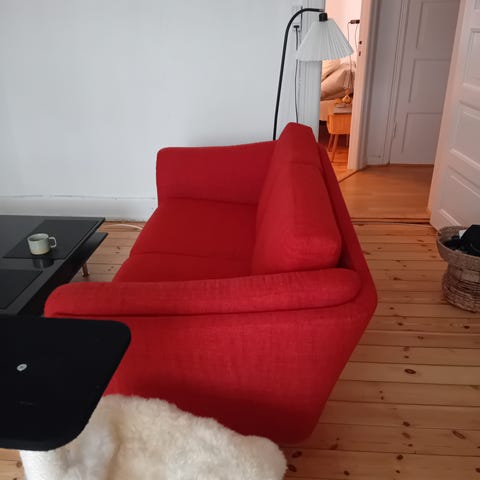 Rød sofa med træbase, to løse rygpuder og to løse armlænspuder. Sofaen har et klassisk design med blødt stofbetræk og en dekorativ træramme nederst. Velegnet til stue eller opholdsrum.