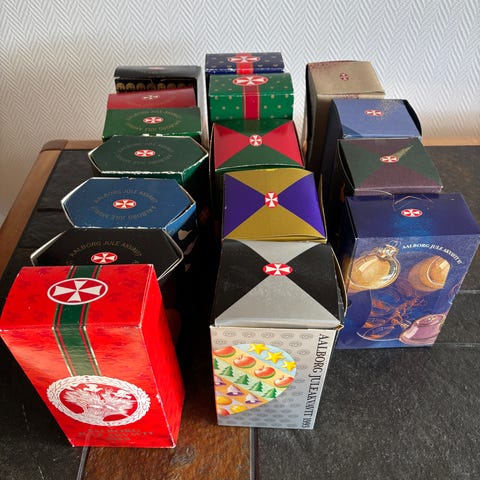 2 stk. Aalborg Jule Akvavit, fra 2003 og 2011 i original emballage. Flaskerne er med banderole og har aldrig været åbnet. Æskerne er i god stand. Pris pr stk 125,- kr., begge to for 225,- kr.