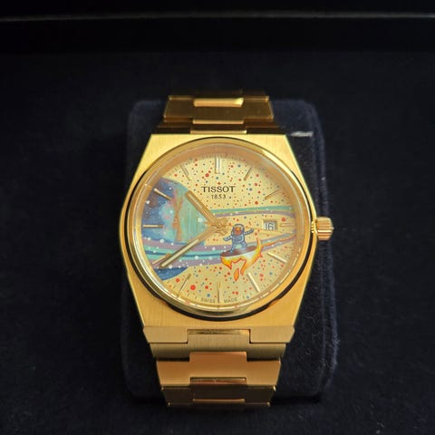 Den roste Tissot PRX Chronograph i en lidt federe version. Buccherer limiteret udgave med en vlld blå sunburst urskive, der changerer fra sort til lyseblå. Desuden er den limiterede udgave med guldlynette og guldkant omkring subdials.