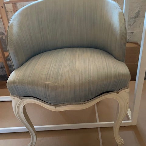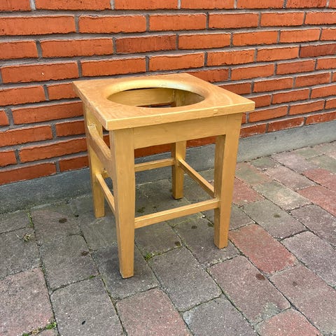Fin antik toiletstol i mørkt træ, ombetrukket i natur hør stof. Stolen er fyldt med kobber fjeder og har en rigtig god sidde komfort.