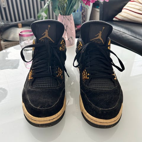 Air Jordan Sneakers i størrelse 45. Skoene er primært sorte med gule detaljer og har en hvid sål. Designet til både sport og fritidsbrug.