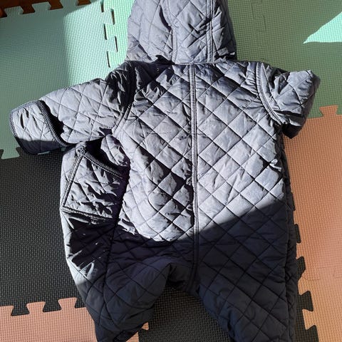 KappAhl baby flyverdragt i blå farve, størrelse 62, designet til både drenge og piger (unisex). Flyverdragten har en blød, varm foring og hætte, der giver ekstra beskyttelse mod kulde. Den har trykknapper langs benene og foran for nem påklædning og aftagning. Materialet er velegnet til at holde barnet varmt i køligt vejr.
