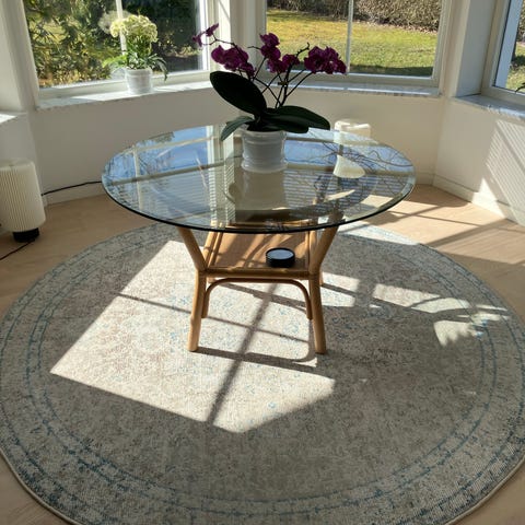 Glasbord med bambusstel i spisestue størrelse 100 x150 cm. sælges for 400 kr. Det lille glasbord er også til salg for 300 kr.