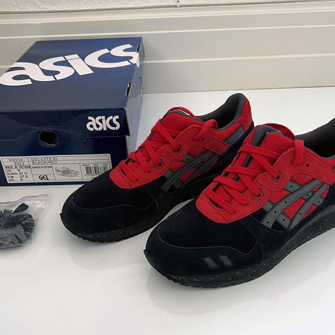 Asics Lyte Classic Sneakers i størrelse 42,5 Skoene er i sort og grå farve med kombination af materialer, der inkluderer tekstil og ruskind. Designet til daglig brug og let træning.