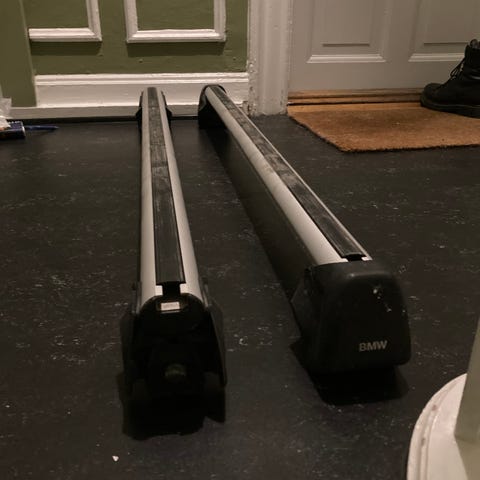 BMW Tagbøjler i aluminium med sort plast ved enderne. Passer til montering på bilens tag for transport af ekstra last. Farve: sølv med sorte endestykker.