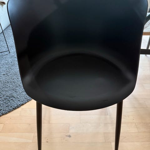 4 Bent Hansen stole med sort stel. Det er modellen som der ikke kan dreje. Den ene stol er gået lidt i sygningen(se billede 2) og bør enten limes eller syes. Stolene sælges samlet.