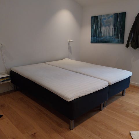 Vi sælger 2 boxmadrasser som er uden pletter og slid.