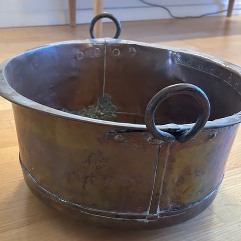 Vintage gammel stor kobberspand med smuk patina – perfekt som brændekurv, opbevaring eller plante beholder