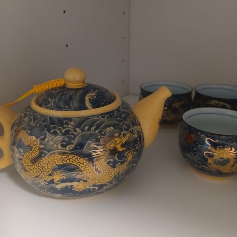 Ukendt mærke Kinesisk porcelæn tekande (H: 16cm)og to krukker (H:12 og 10cm) med låg, dekoreret med flerfarvet blomster- og dyremotiv på sort baggrund. Tekanden har flettet hank. Sættet inkluderer også 9 små skåle (H:5cm) og 10 skeer med matchende mønster. Materiale: Porcelæn. Farver: Sort, rød, blå, gul, grøn og hvid. Anvendelse: Til servering og opbevaring af te og krydderier.