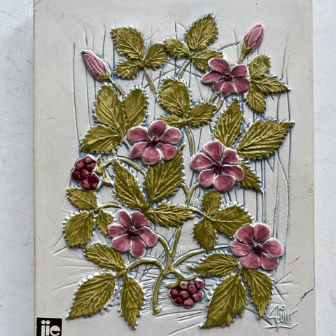 Fint, større keramikrelief fra svenske Jie Gantofta. Nr. 752 med motiv af hus, lyserøde blomster og æg i rede. Uden skår eller afslag. Mål: 31x20x1,5 cm. Fra ikke-ryger hjem.
