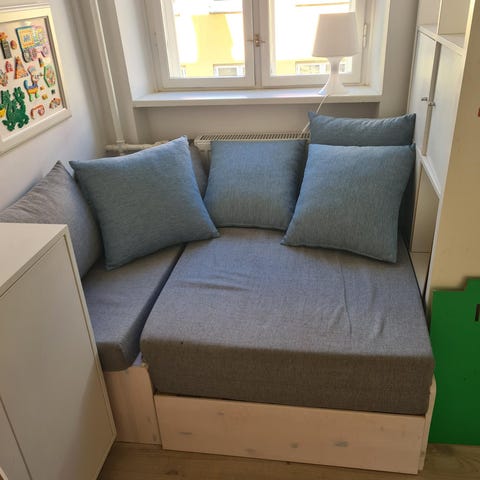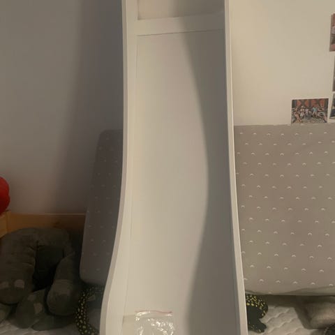 Ruchebane til at sætte på seng. Hørte til en seng fra FLEXA, men kan sikkert sagtens bruges på de fleste andre senge. Kroge på bagsiden til at komme den hurtigt af og på (ideelt til fx. små værelser) og eller kan den også skrues fast. Der er lidt slidmærker nedenunder og lidt på siderne også men det er ikke noget man lægger meget mærke til og ellers i god stand.