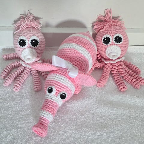 Sød og blød elefant med rasle i halen, pive-funktion i snablen, bjælde inde i kroppen og spejl under den, ca. 30x25x15 cm.