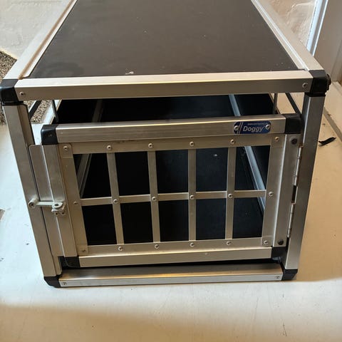 Enkelt og let transportbur i aluminium med sort panel og måtte i bunden. Brugt under 10 gange men sælges pga. udskiftning af bil (købt til og passer perfekt til VW Touran og andre 7-personers biler, hvor der stadig kan være 6 sæder samtidig med buret). Se mål på billedet. Nødudgang i bagenden. Nypris 2.400 kr., købt 31. juli 2025, kvittering og garanti medfølger naturligvis.
