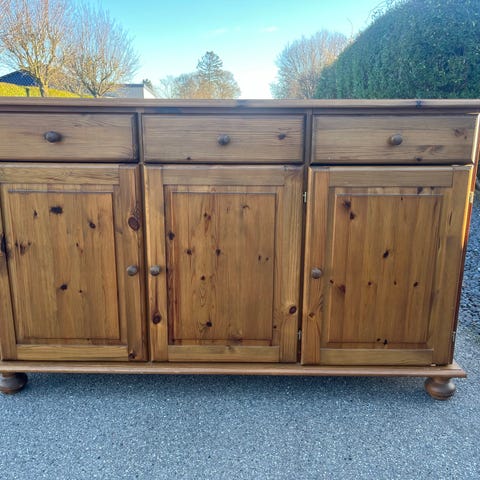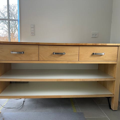 Flot og velholdt køkkenskænk. En en ældre model der er lavet i solide materialer så den er tung og robust. Den har fine små greb i blå/røde mønster. Hylderne kan justeres i højden.
