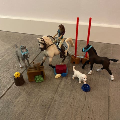 Der er bl.a. 3 schleich heste, frisørsæt, pop its, hårelastikker, diamonds, en Frost halskæde med lys og lyd.