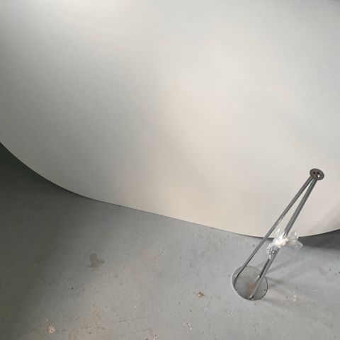 Spisebord med hvid bordplade i Corian, ben og stel i børstet stål. Bordet har et enkelt og funktionelt design med en glat overflade og firkantede metalben. Velegnet til spisestue eller køkken med plads til flere personer. Bordpladen ligger 5 mm. skævt på stellet på langs, det kan justeres så det kommer til at passe igen.