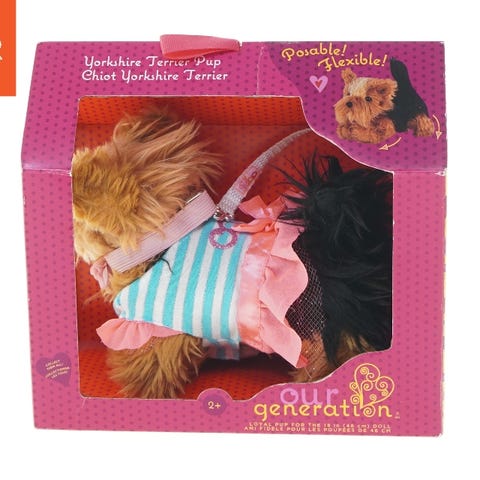 Dette er et Scottish Terrier Pup tøjdyr fra 'Our Generation' serien. Det er 20x13x10 cm stort og kommer i en farverig æske med pink, orange og en illustration af hunden. Tøjdyret har en sort pels og er klædt i en ternet blå og pink skjorte med en gul strik hue. Æsken markerer, at tøjdyret er posable/fleksibelt og indeholder en krave og snor.