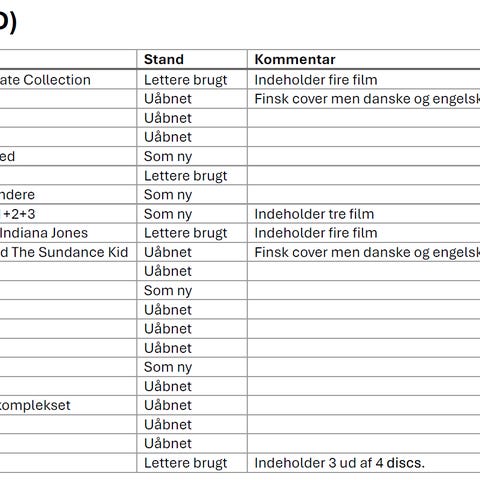 En samling af forskellige DVD-film i standard størrelse. Indeholder flere titler og genrer, alle i original etui. Nogle endda uåbnede.