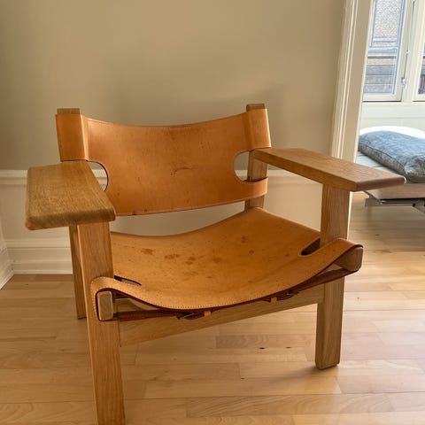 Denne smukt formede stol er inspirerer af Wegner og Børge Mogensen. Det er et svendestykke købt for år tilbage. Butikken eksistere ikke længere. Den er i god stand hvor er par af bændlerne i bunden lige skal have et par hæfteklammer. Læder og træ er velholdt. Bredde 70 dybde 80 højde 68.