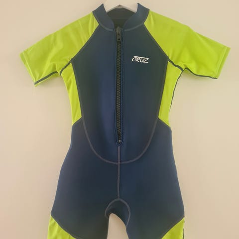 Svømmedragt / våddragt i 2 mm neopren. Str 4, dvs ca str 6 år når der læser målende på billede2 som siger 118-126cm.