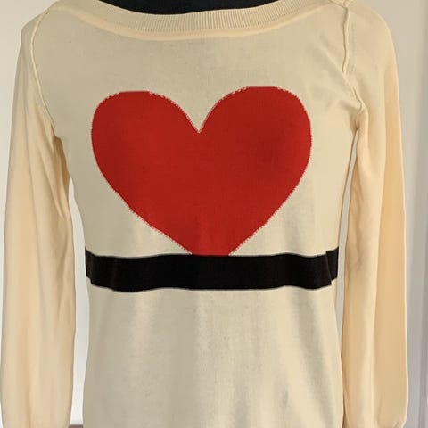 Sonia Rykiel bluse i farverne hvid og sort med dekorative detaljer se billederne. Størrelsen på blusen er L med et brystmål på cirka 112 cm og en længde på cirka 61 cm. Blusen er fremstillet af 100% bomuld.