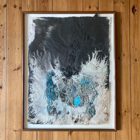 Stort smukt maleri i varme farver af kunstneren Anne Vilsbøll, som har lavet kunst til Udenrigsministeriet og Maersk Delft