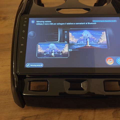 Renault bilradio med CD-afspiller. Enheden har knapper til radio, CD, lydstyrke, og navigation gennem spor.