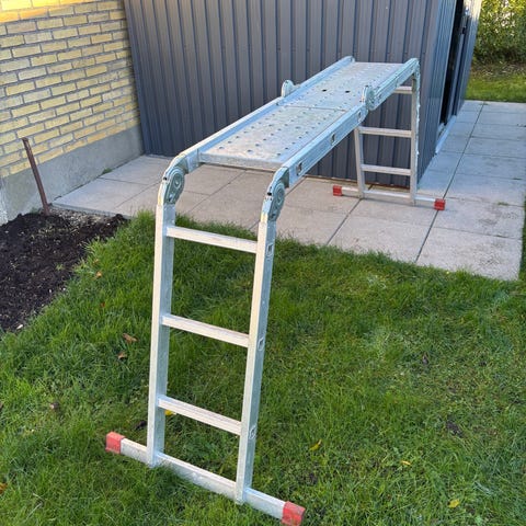 Stillads og multifunktionel stige. Platformen kan justeres til forskellige højder og kan anvendes på trapper. Stigen kan bruges som skydestige, wienerstige mv. Belastningskapacitet på 150 kg. PLATFORMEN måler cirka 1,60 meter i længden og 0,50 meter i bredden.