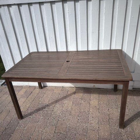 Super lækkert teaktræs havebord som trænger lidt til en kærlig hånd - så kan det også stå næsten som nyt - der er 2 stk. tillægsplader, som skjules under bordplade når de ikke skal bruges havebordet er 100 cm bred og 200 cm langt i mindste mål og kan forlænges med enten 50 eller 100 cm