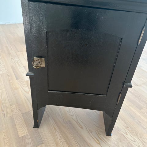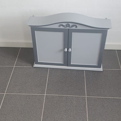 Fin lille grønt skab med gammel hyldepapir på bagsiden. Det måler 24 x 25,50 x 12 cm. Rigtig fin til at stå til pynt