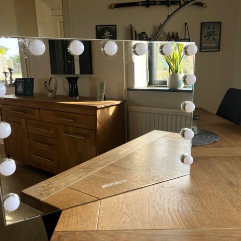 makeup spejl med kvadratisk form og mål på cirka 80x65 cm. Spejlet er udstyret med en lyskæde med hvide pærer monteret rundt om kanten. Lyskæden er tilsluttet med ledning, som kan ses på billederne. Spejlet kan anvendes til boligindretning, makeup eller som dekorativt element.