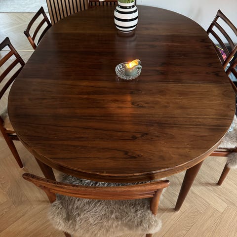 Sælger dette palisander bord med 2 indbyggede tillægsplader og 6 stole af samme art og farve 🤎